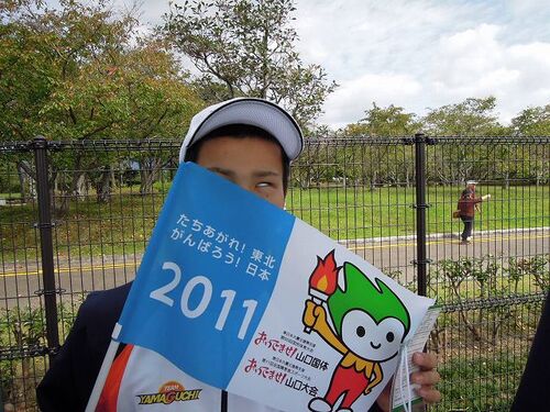 昨日の山口国体の総合開会式の様子でも。 サブトラックに集合して入場の練習です。 旗を振るタイミングの練習を。 久保田君、真面目にしましょう。 練習が終わったら昼食タイム。 競技場にくると興奮してしまう? メイン会場の裏には沢山のブースがありまし…