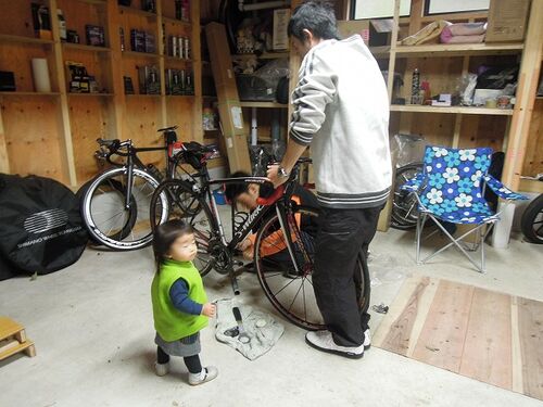 この前の週末の様子です。 自転車整備をしていると、ののが歩いて寄ってきます。 もうすっかり普通に歩けます。 この黄緑のパタゴニアのベスト。 毎日毎日使っているから完全に元はとってますね。 それでもクタクタにならないところがステキです♪ ガレージの…