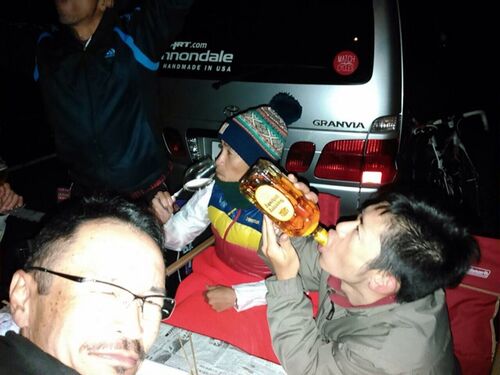 秋吉台のレースが終わったらそのまま祝勝会~ いつも通り瓶が面白いように空いていきます(笑) 明るくなりそうだったので5時半に終了~ 最後の2時間くらいは寒くて白湯を飲んでましたね… 朝ごはん~ カングーにこのタープ、ちょうどイイですね。 バックドア…